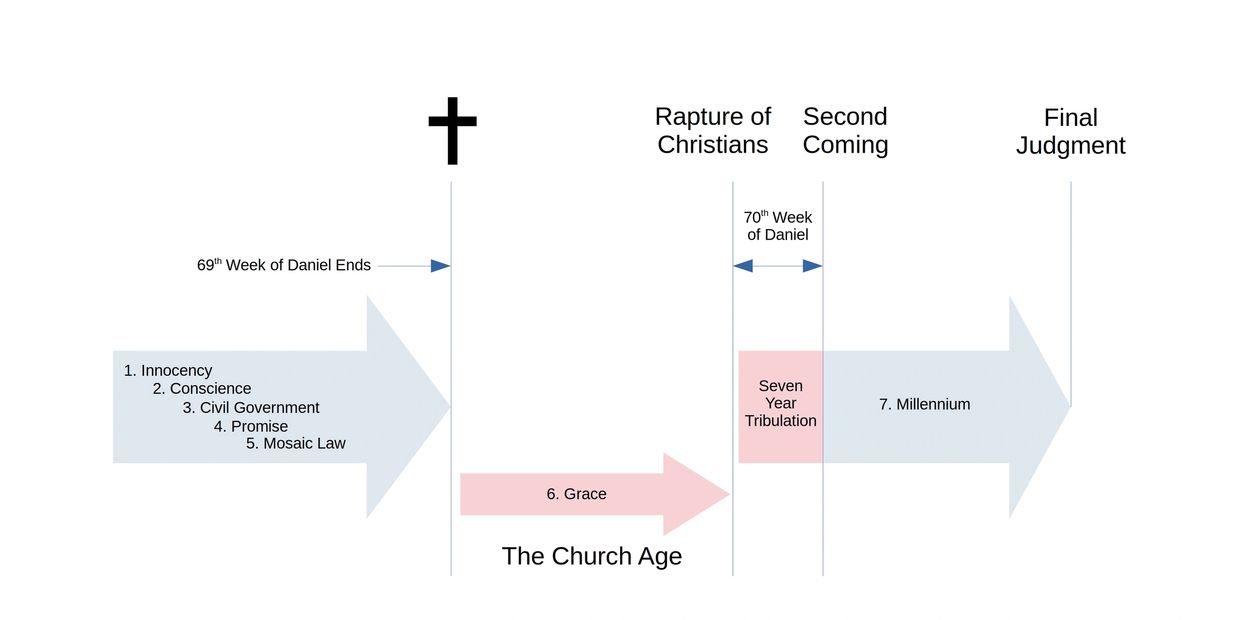 Darby is considered to be the father of dispensationalism, an interpretive framework that separates the Bible into different ages, as shown in Figure 2. Like dispensationalists today, Darby drew distinctions between the Church and Israel, such as rejecting that the Church receives the blessings of Israel. Darby emphasized futurism, the belief that many of the prophecies of the Old Testament have yet to be fulfilled. Darby and others believed that Israel would have to go through a tribulation period before Jesus would restore the nation of Israel. He believed that Daniel 9:27 described a future seven-year tribulation, and that Jesus would return at the conclusion of this great tribulation.